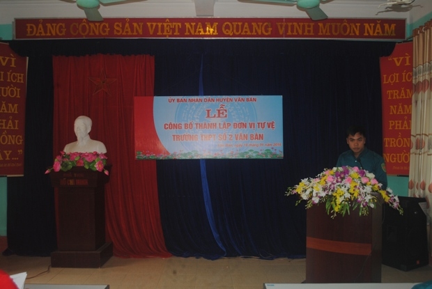 Đến dự với buổi lễ có đồng chí Trần Thị Thanh Huyền – bí thư chi bộ - phó hiệu trưởng phụ trách nhà trường cùng các đồng chí trong ban giám hiệu, cán bộ giáo viên, nhân viên trong nhà trường.  Đồng chí Trần Thị Thanh Huyền - phó bí thư chi bộ - phó hiệu trưởng phụ trách nhà trường đọc quyết định số 1078/QĐ-BCH ngày 17 tháng 12 năm 2015 của Ban chỉ huy quân sự huyện Văn Bàn về việc thành lập đơn vị tự vệ trường THPT số 2 Văn Bàn.